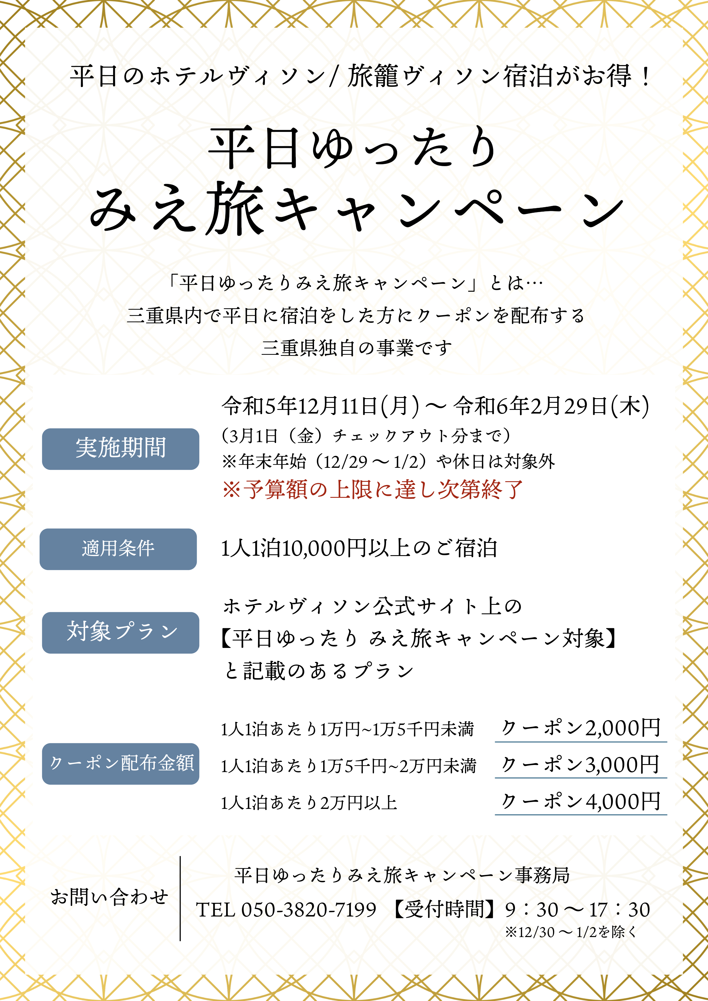 ※12月8日(金)からのホテルヴィソン公式サイト上の 【平日ゆったり みえ旅キャンペーン対象】 と記載のあるプランでの新規宿泊予約のみが対象です。
