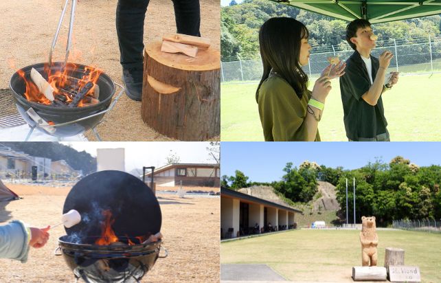 kiond前の芝生広場で、美しい森を眺めながら焚火を囲んで温まるイベント!